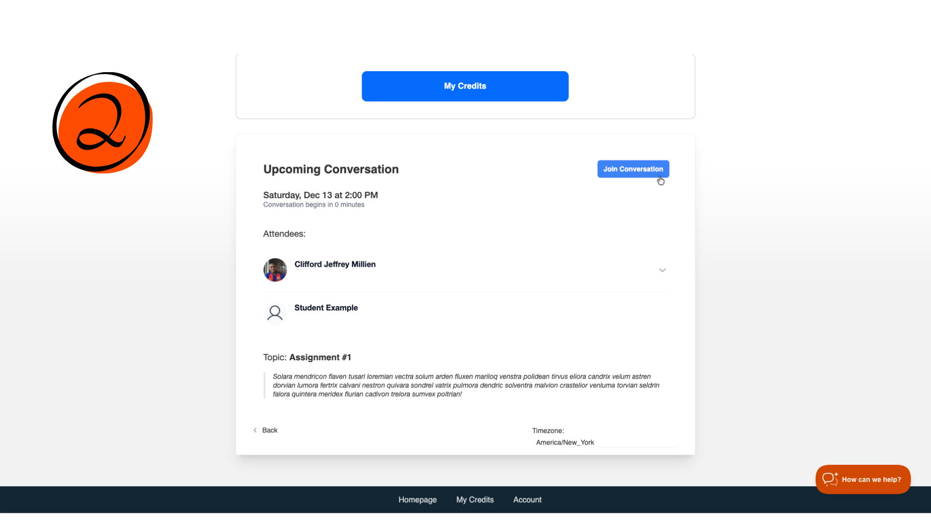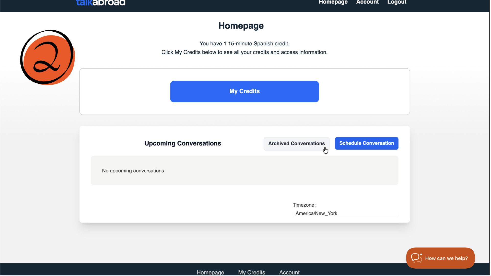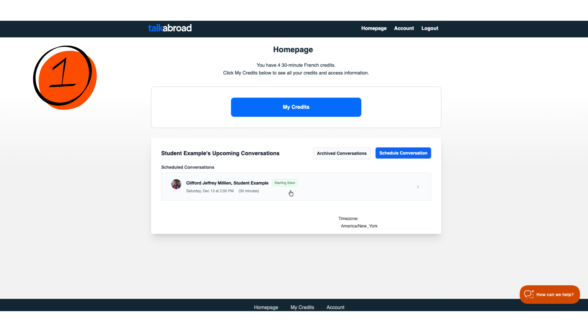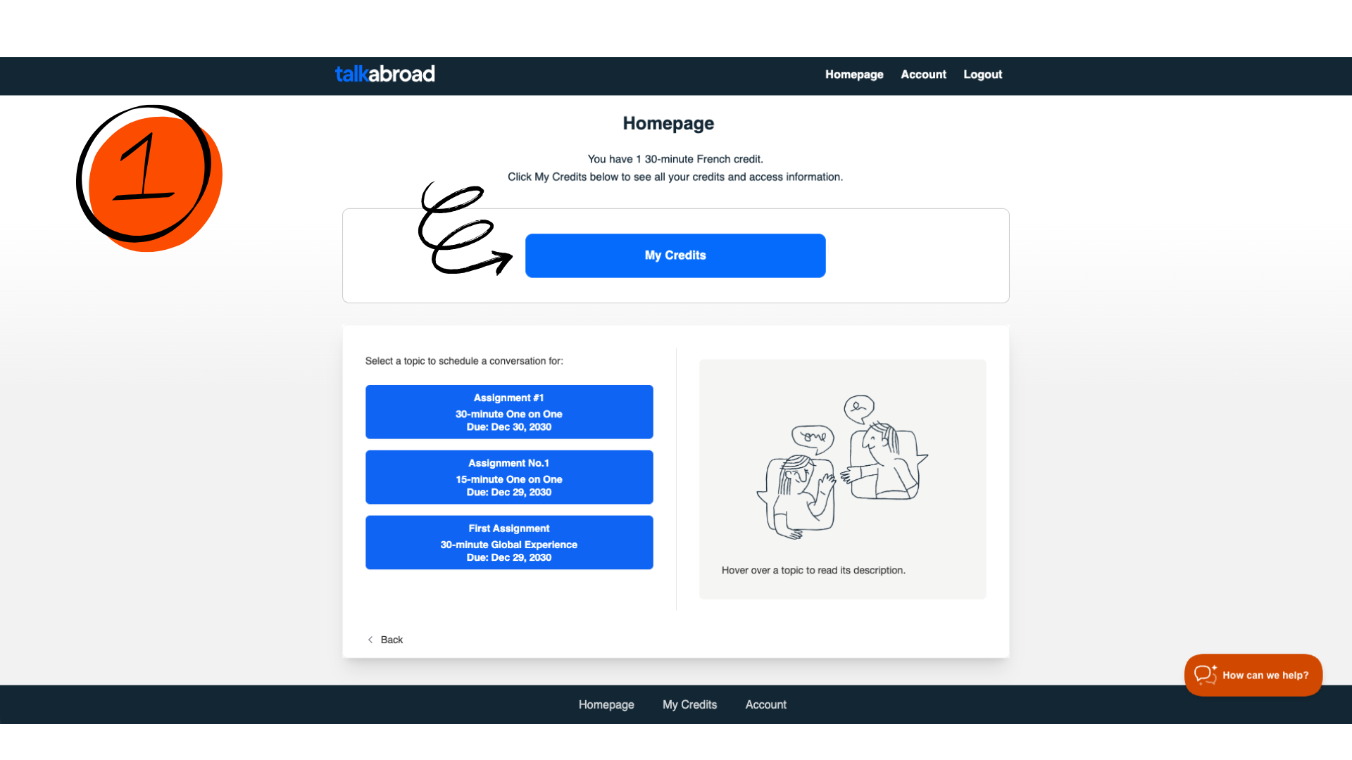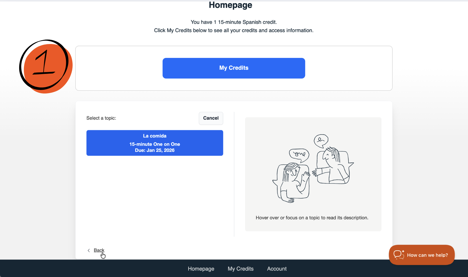 You are now at your homepage. Before reserving a time for a conversation you will need to purchase credits or redeem a pre-purchase code. Click on My Credits. Be careful to select the correct amount and length for your credits.