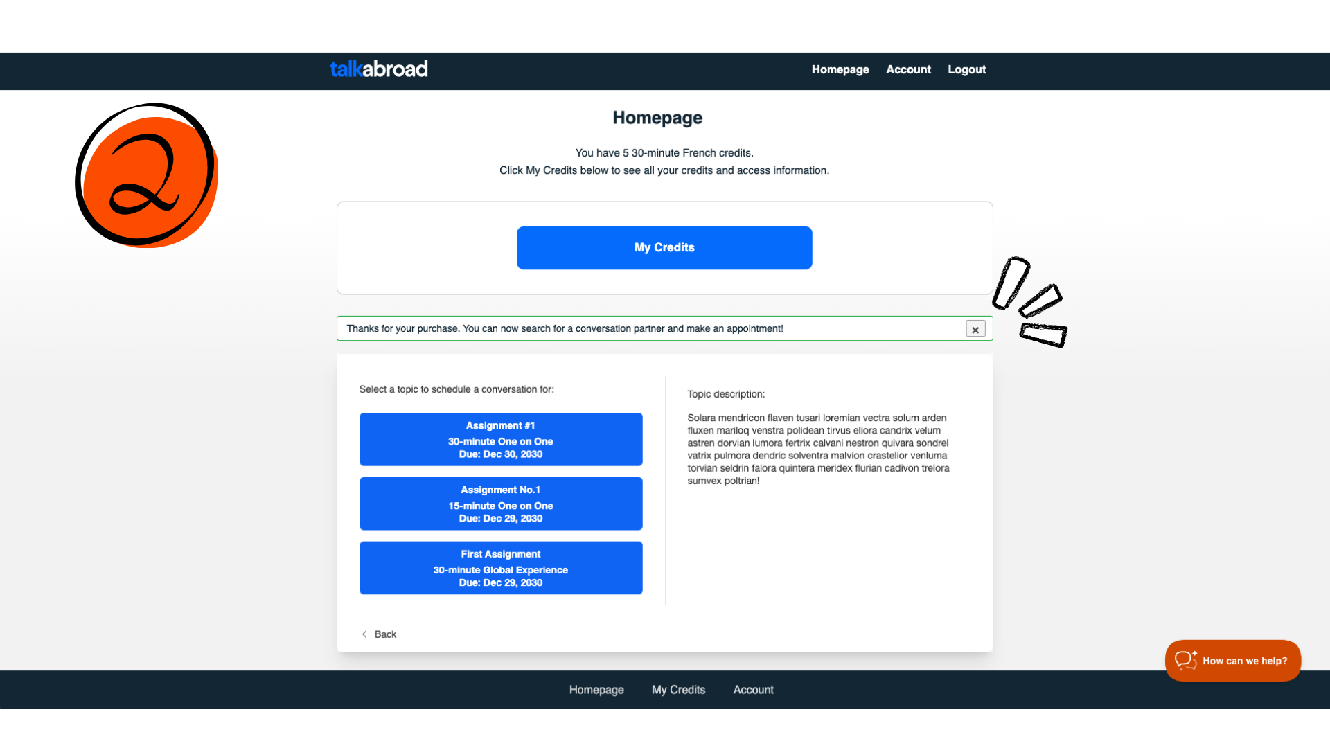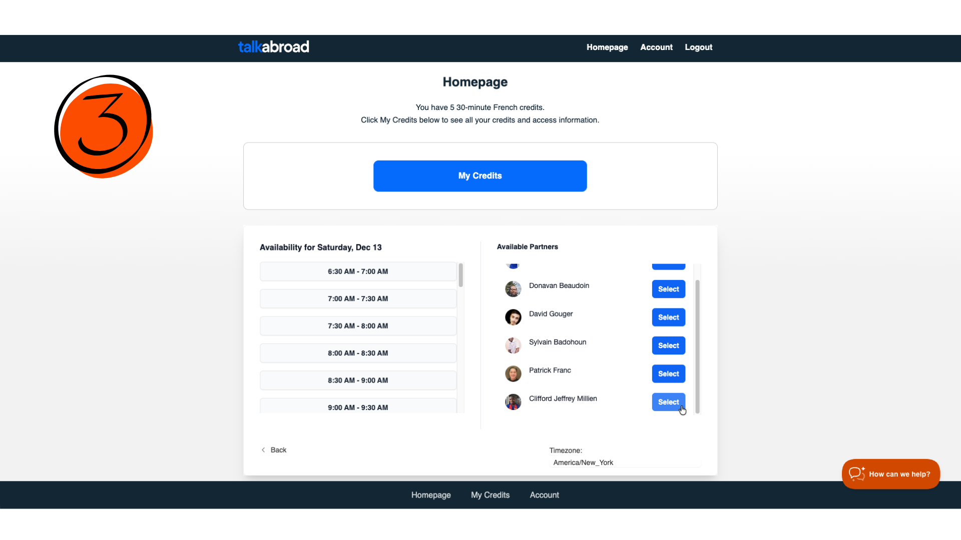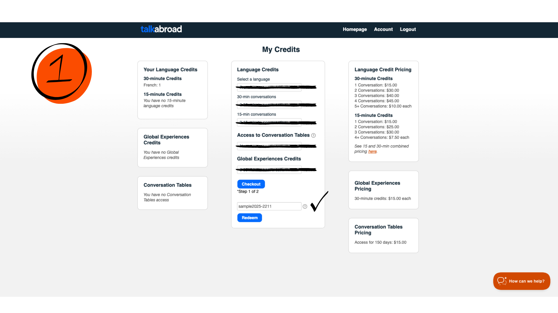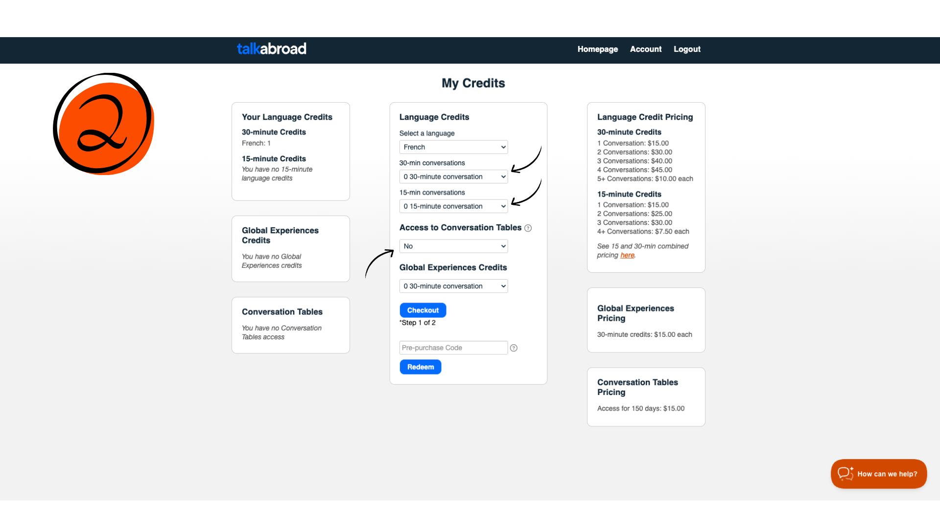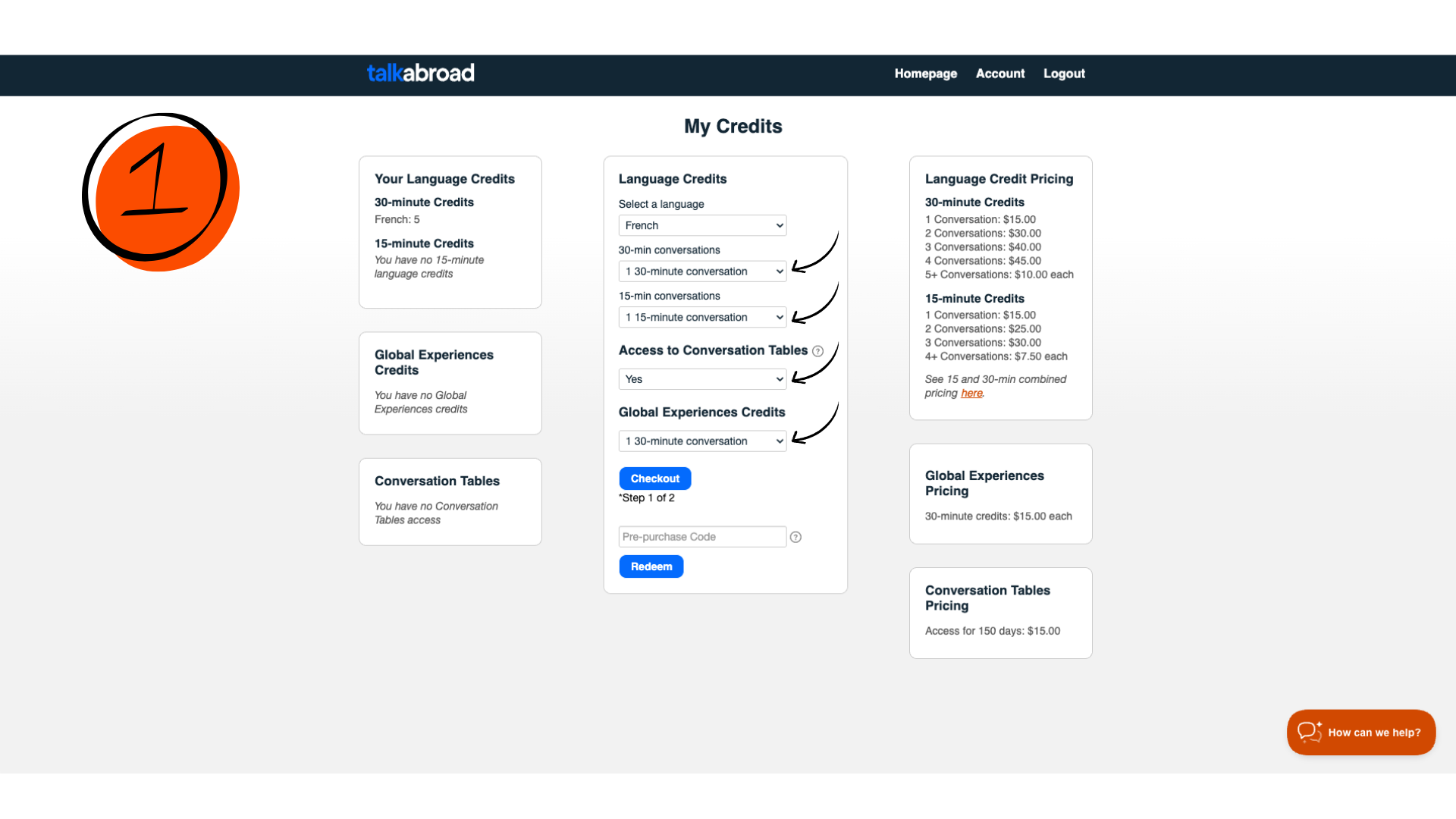 You are now at your homepage. Before reserving a time for a conversation you will need to purchase credits or redeem a pre-purchase code. Click on My Credits. Be careful to select the correct amount and length for your credits.