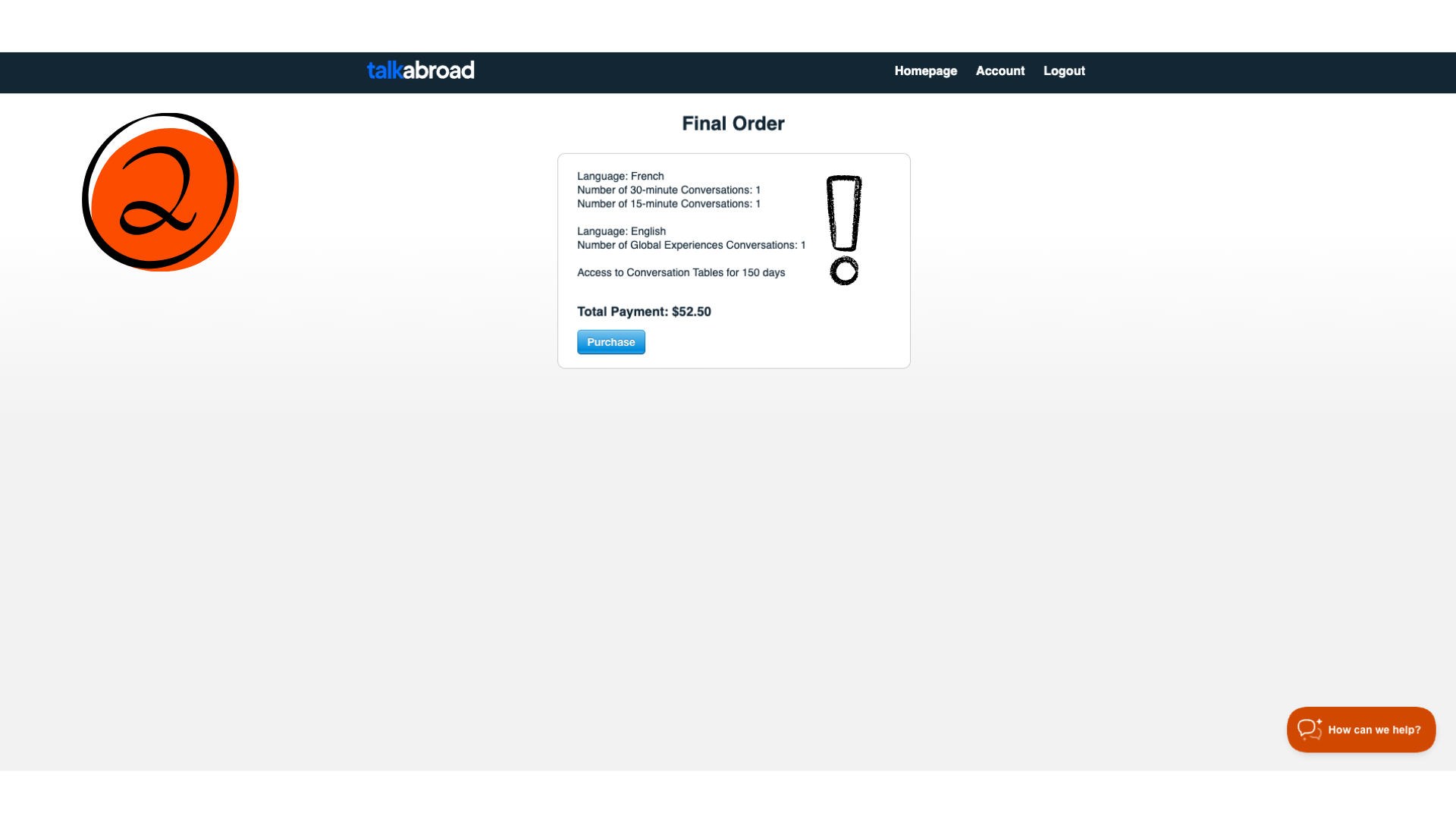 If you have any questions or concerns, please email us at support@talkabroad.com or use the help button at the bottom of our website. If possible, please contact TalkAbroad Support before reaching out to your teacher, as we are very experienced in helping students navigate the site. You can expect a response within a few hours during business hours, and often much sooner.