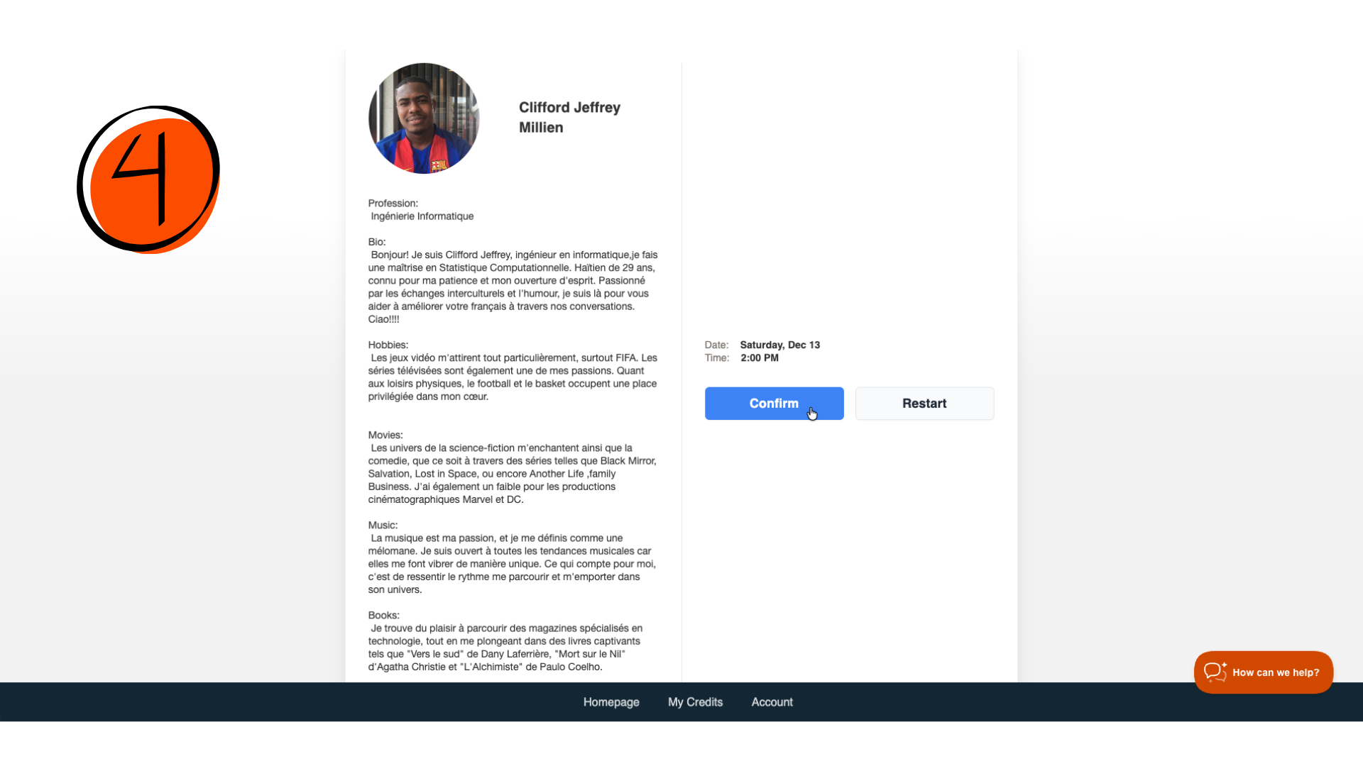 To create your conversation, click Confirm. You will be sent a confirmation email with details and instructions. To confirm that your conversation was successfully created, you can also look at your Student Homepage. You should now see the upcoming conversations.